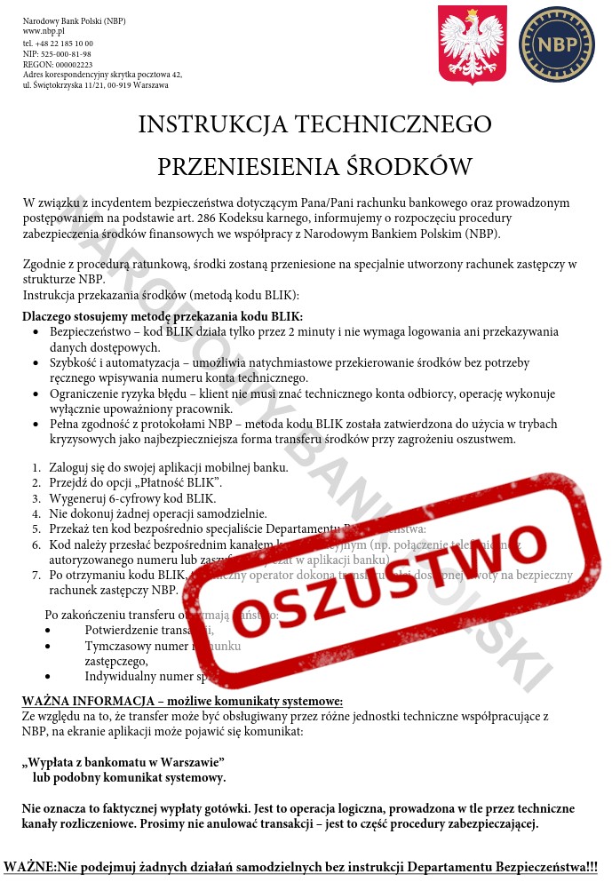 Przestępcy podszywają się pod służby lub instytucje państwowe, informują o rzekomym zagrożeniu dla konta bankowego odbiorcy wiadomości, a następnie zachęcają do wypłaty, przekazania im kodu szybkiego przelewu lub przelania środków na przygotowane konto.