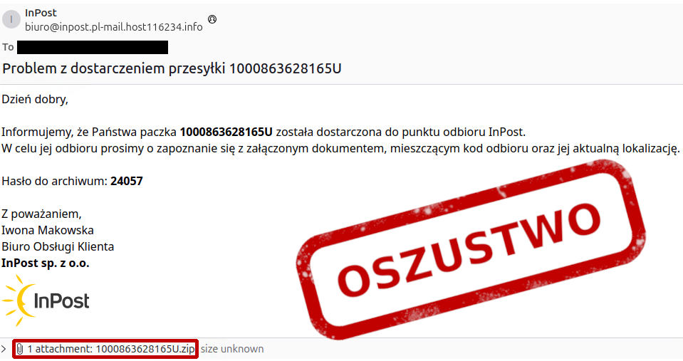 Mamy jesień, za oknem coraz zimniej, więc wiele osób zamiast wychodzić z domu zamawia paczki - oszuści wykorzystują ten fakt i regularnie podszywają się pod firmy kurierskie! W najnowszej odsłonie tej kampanii przestępcy rozsyłają wiadomości mailowe zawierające informację o paczce rzekomo oczekującej na odbiór. Zachęcają do otwarcia załącznika aby poznać szczegóły.