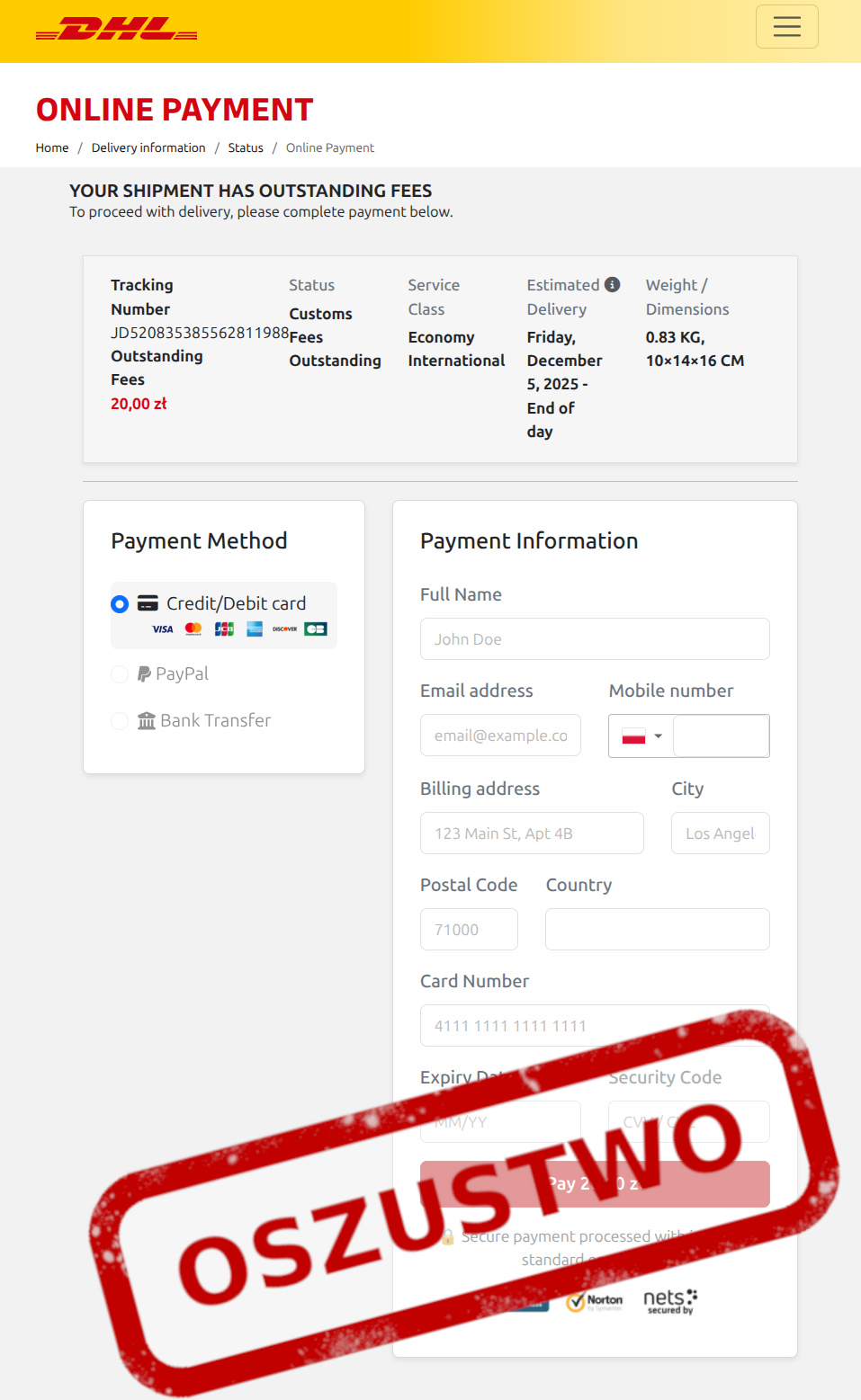 Po kliknięciu w link ofiara trafia na fałszywy formularz, który służy do wyłudzenia danych karty płatniczej. Przestępcy mogą następnie dokonywać nieautoryzowanych transakcji na rachunkach poszkodowanych.