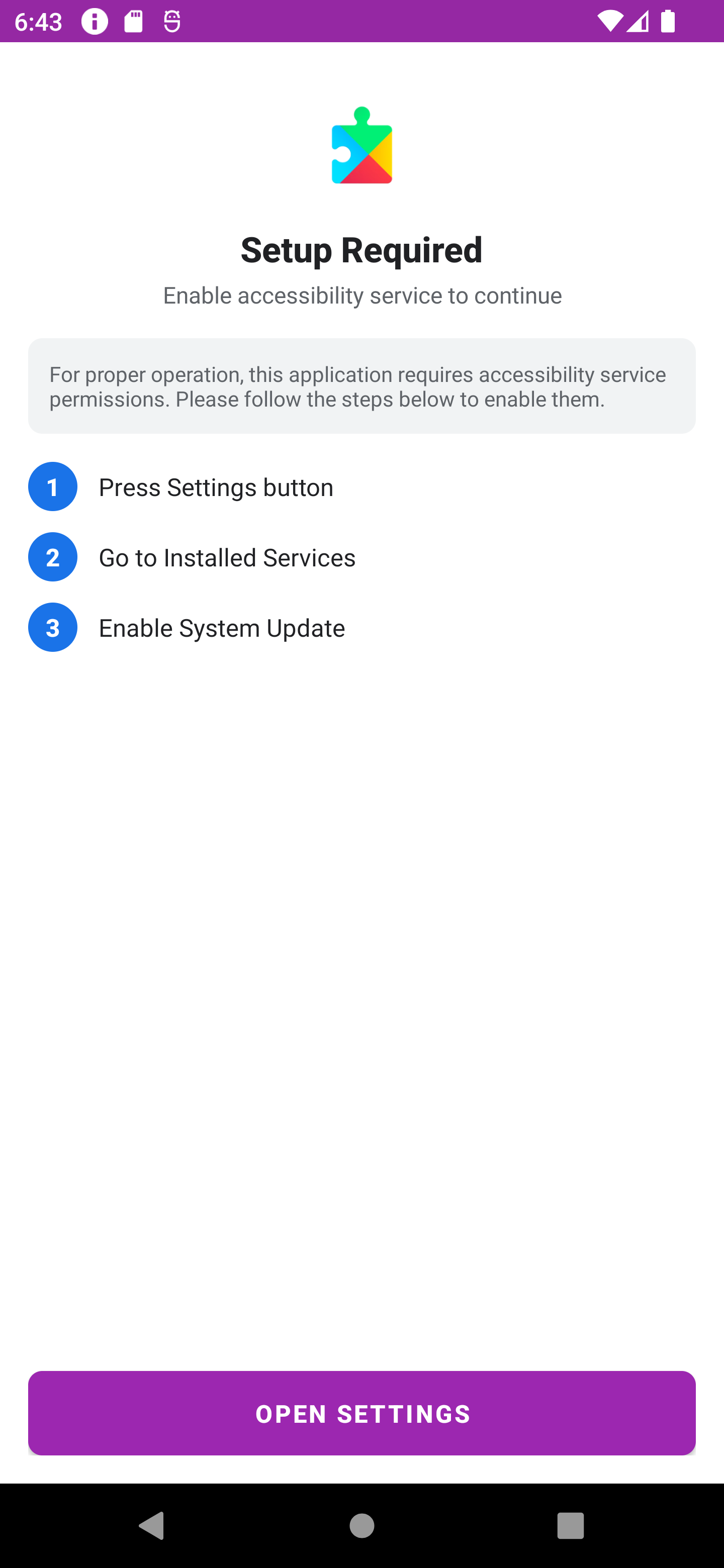 Użytkownik uruchamia aplikację wykorzystującą wizerunek SGB i na ekranie startowym widzi komunikat o konieczności instalacji Play Component oraz tekst nakłaniający go do uruchomienia procesu instalacji za pomocą guzika Install Component.