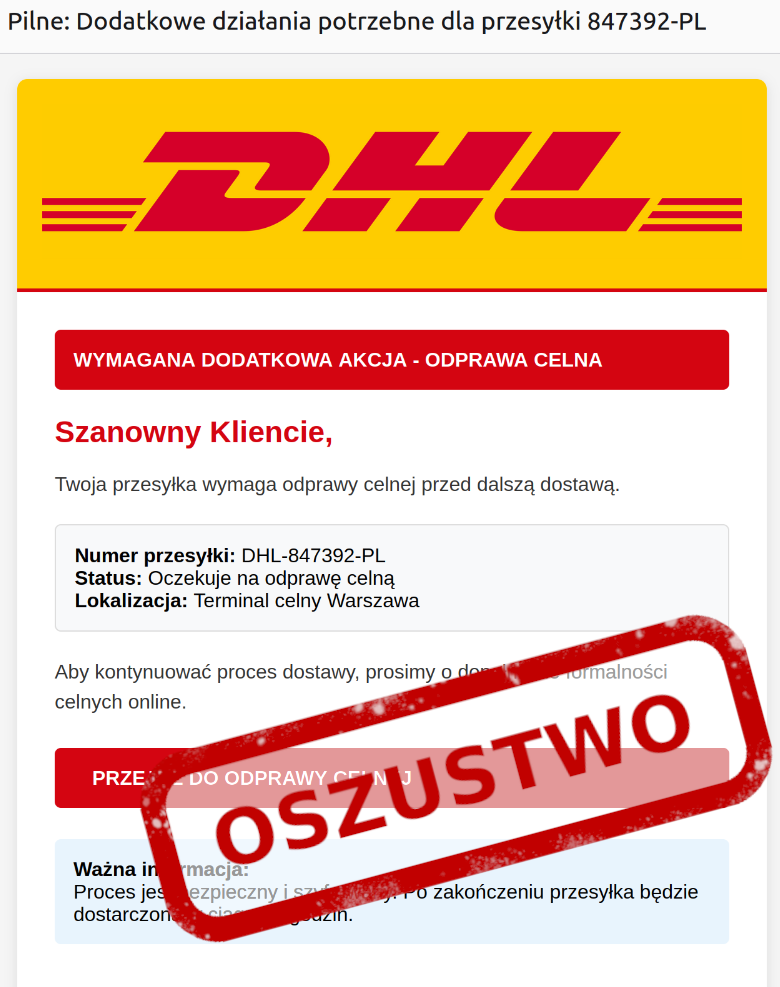 Ten właśnie moment próbują wykorzystać cyberprzestępcy! Obserwujemy kolejną kampanię phishingową, w której oszuści podszywają się pod firmę kurierską. Tym razem pod DHL, ale warto pamiętać, że zmiana logotypu czy nazwy to dla przestępców kwestia kilku chwil - podobne ataki mogą wykorzystywać logo dowolnej firmy. W wiadomościach e-mail przestępcy informują o rzekomej konieczności przejścia przez odprawę celną i uiszczenia niewielkiej opłaty, aby przesyłka mogła zostać dostarczona.